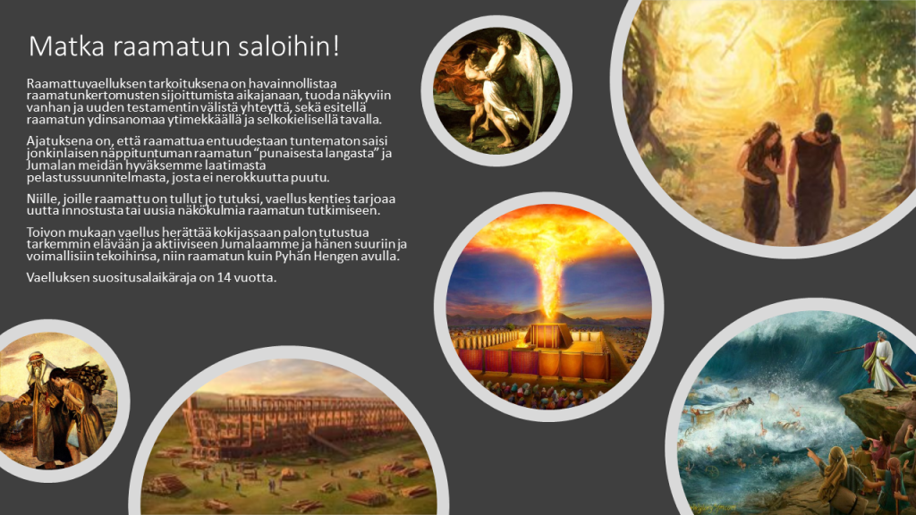 Raamattuvaellus on helpointa läpikäydä katsomalla se videomuodossa tai tutustumalla kuvagalleriaan.