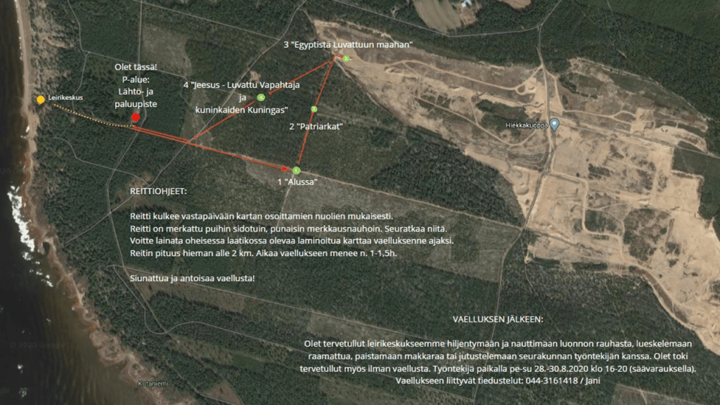 Vaellusreitti kulki maastossa ja oli pituudeltaan hieman alle 2 km. Reitti oli merkitty punaisilla nauhoilla ja laminoituja karttoja oli vapaasti lainattavissa infotaulun laatikossa. Jokaisella vaelluksen neljällä rastipisteellä sijaitsi puinen penkki, sekä Raamattuvaelluksen materiaali kansioituna muovilaatikossaan.