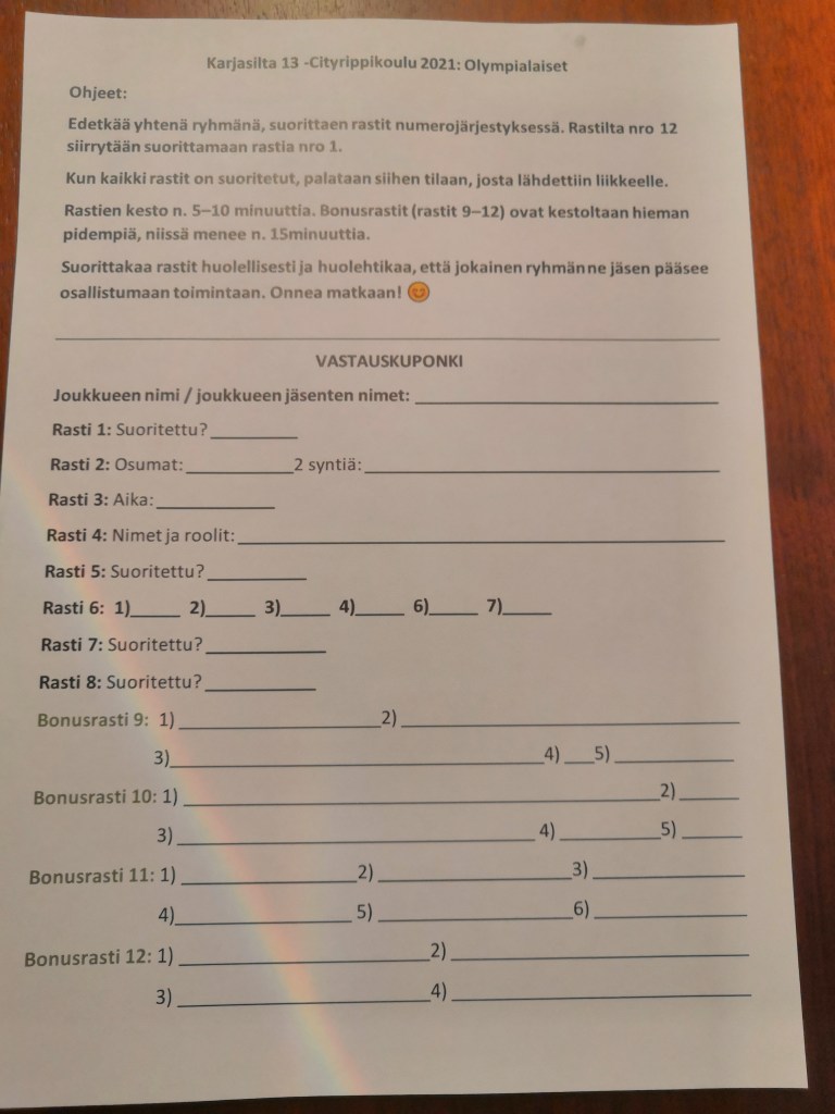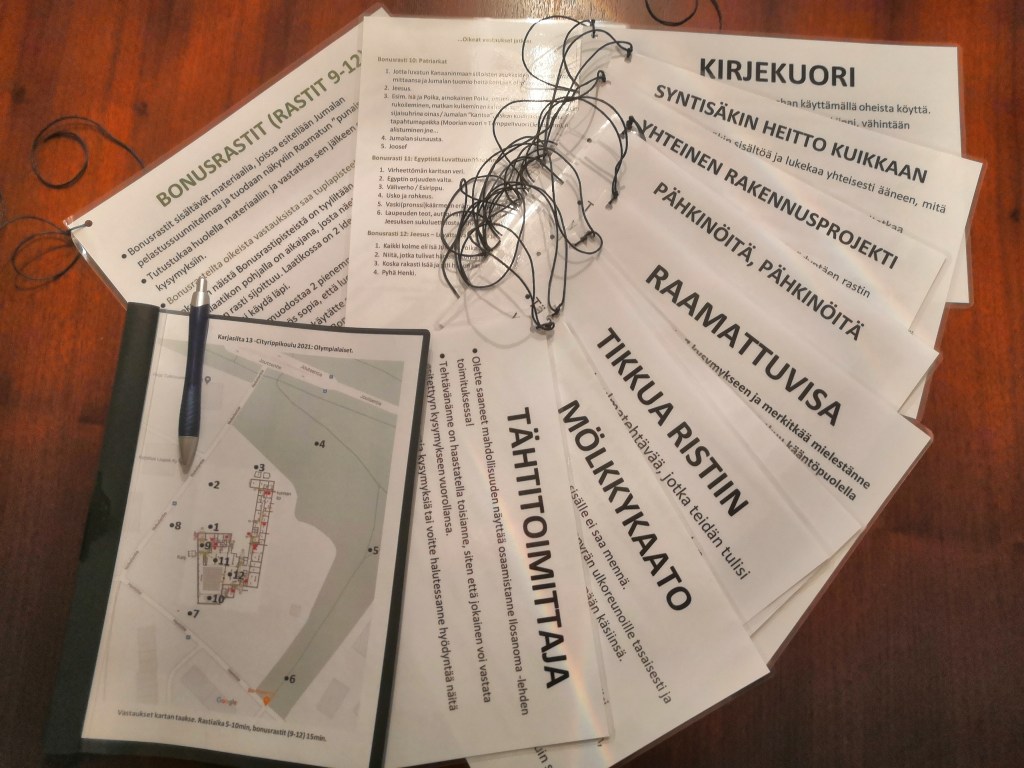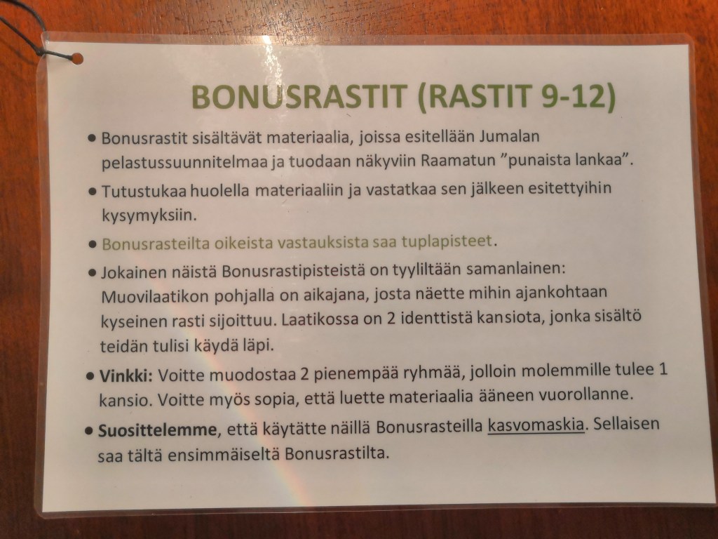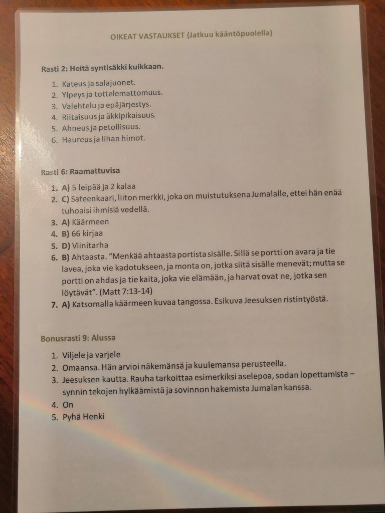 Alla on kuvia Karjasillan seurakunnan rippikouluryhmän (v. 2021), ensitapaamisessa pidetyistä, olympialaisista, joka sisälsi 8 yhteistoiminnallista tehtävärastia sekä 4 bonusrastia (Raamattuvaelluksen 4 osaa). Bonusrasteilta sai tuplapisteet. Raamattuvaellus oli tulostettuna kansioihin, joihin ryhmä tutustui itsenäisesti sekä vastasi niissä esitettyihin kysymyksiin.
