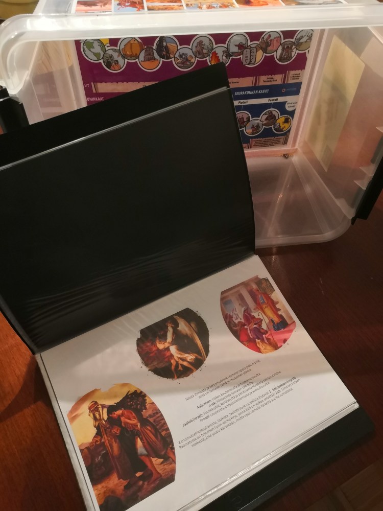 Raamattuvaelluksen voi toteuttaa halutessaan taidegalleriana (1h15min). Tuolloin kuvat voidaan tulostaa ja laminoida/kehystää esimerkiksi A3-kokoisena tai niistä voidaan teettää vieläkin suuremmat kyltit, kuten yllä olevissa kuvissa on tehty (A1-kokoisina).