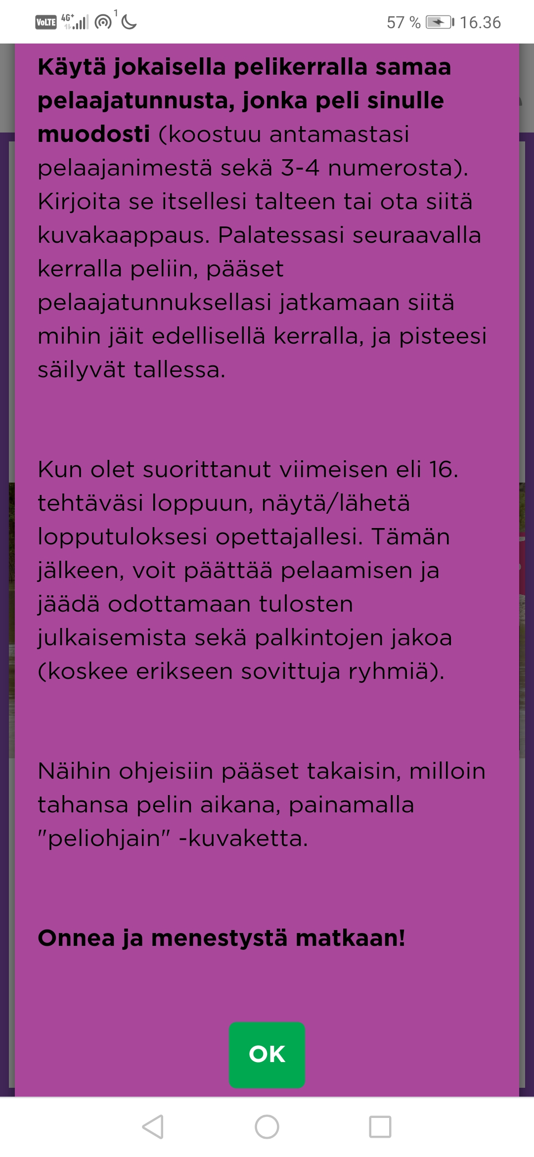 Kun pelaaja on suorittanut kaikki 16 tehtäväänsä, hän voi näyttää lopullisen pistesaldonsa opettajalle, joka kirjaa tulokset itselleen ylös ja palkitsee halutessaan parhaiten menestyneet motivoivin palkinnoin. Myös osallistumispalkinnot on ehkä kivaa jakaa osallistuneille.