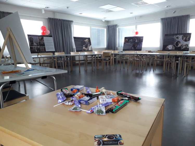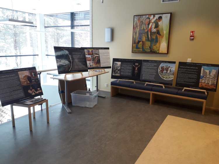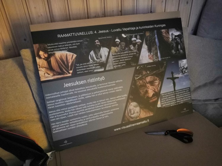 Yllä olevissa kuvissa Raamattuvaelluksen galleriamuotoinen toteutus on järjestetty Oulunsalon seurakunnan rippikouluryhmän Raamattu-oppitunnin yhteydessä keväällä 2022.