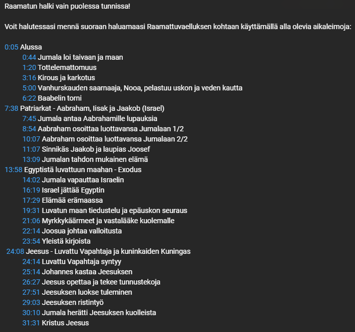 Vinkki: Raamattuvaelluksen YouTube-videon voi laittaa rasteilla kuulumaan vaikka bluetooth kaiuttimesta, sillä lukemista on paljon. Ääniraidan kuuleminen tukee auditiivisia oppijoita sekä niitä, joilla on haasteita lukemisen kanssa. YouTube-videon lisätiedoissa (”näytä lisää”) on aikaleimat jokaiseen osioon ja kuvaan erikseen. Aikaleimaa (alakuvassa sinisellä) klikkaamalla pääset siirtymään videossa/ääniraidassa suoraan haluamaasi kohtaan (Ks. kuva alla). Toisella rastilla voit klikata kohtaa 7:38, kolmannella rastilla kohtaa 13:58 jne.